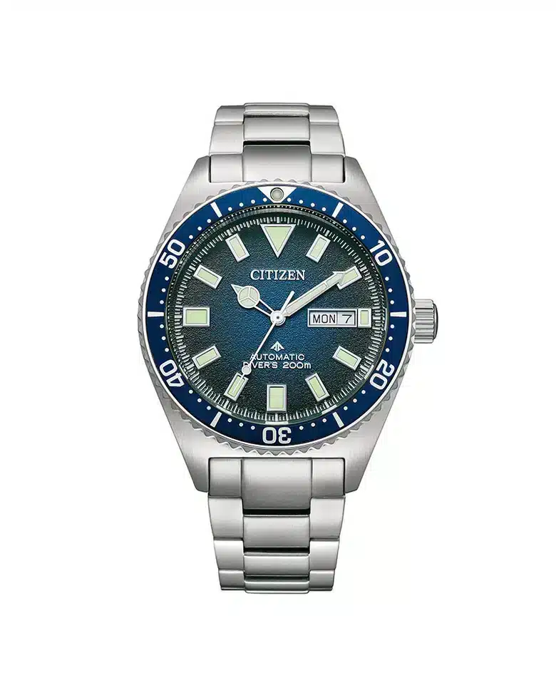 Challenger Diver er en ny automatikk klokke fra Citizen. Dette dykkeruret har både lenke og urkasse laget av rustfritt stål. Urskiven er blå i midten og blir gradvis mørkere mot kanten, noe som gir klokken en unik look. Skiven har dag- og datovisning og indekser som lyser i mørket. Klokken måler 41mm, har mineralglass og en vanntetthet på 20 ATM. Denne allsidige klokken er klar for nye eventyr, enten det er i vann eller på land.