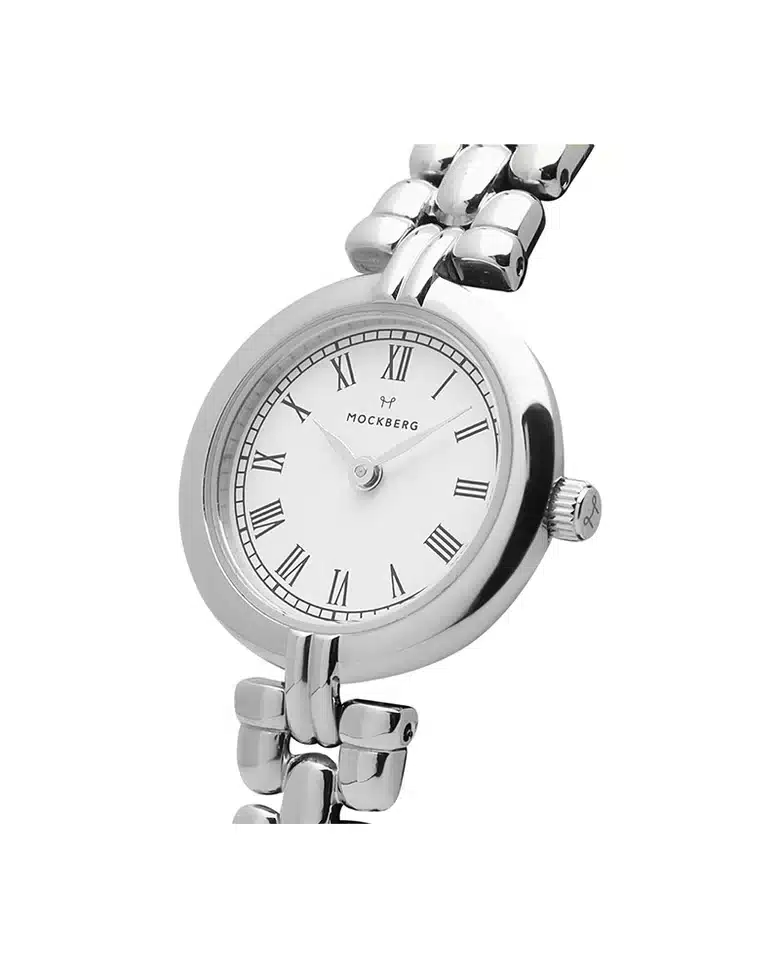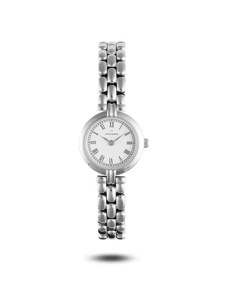 En lekker, liten klokke fra Mockberg, laget i samarbeid med den norske moteikonet Tine Andera. Lenken er laget av rustfritt stål og skiven er hvit med sorte romertall. Klokken måler 24mm.