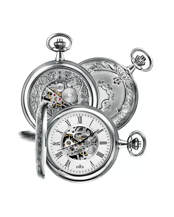 Mekanisk lommeur fra Inex med romertall og fine detaljer. Uret er sølvfarget og 50 mm. Dobbeltkapslet.