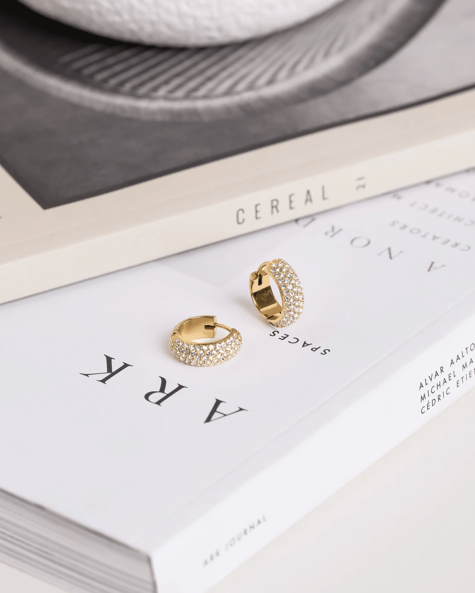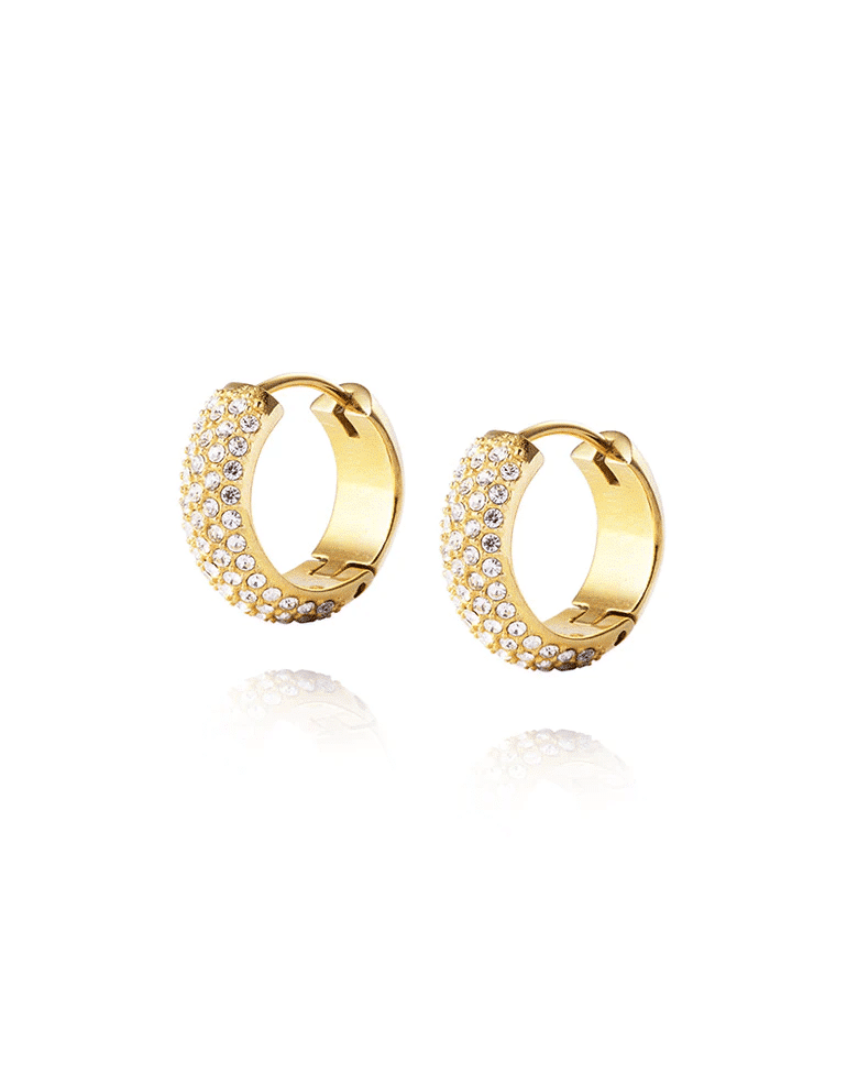 Fine øreringer fra Mockberg laget av massivt rustfritt stål med et 18K Gull PVD-belegg. Øreringene tåler vann og er veldig slitesterke. Her kan du både trene, dusje og danse uten å være redd for at de mister farge.