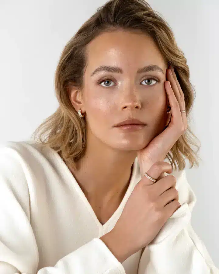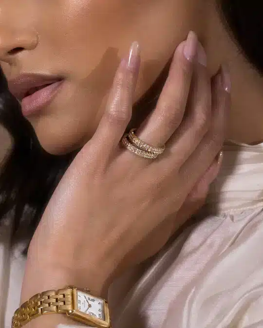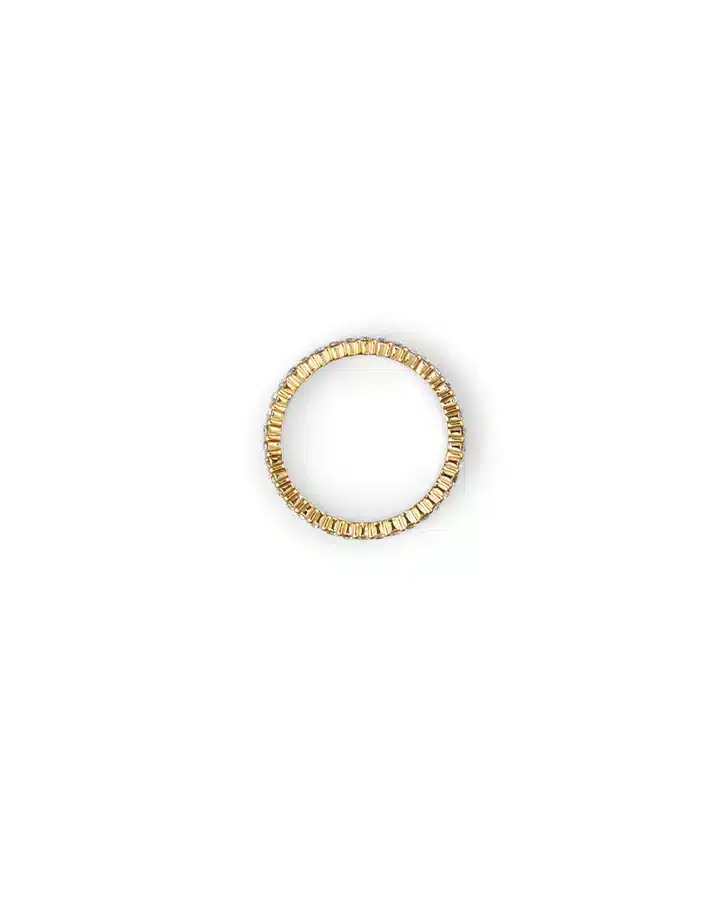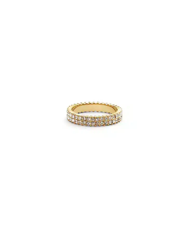 En nydelig glitrende ring fra Mockberg, laget av messing med et 18K gull PVD-belegg. Dette gjør at ringen er meget slitesterk og at den tåler vann. Her kan man både trene og dusje uten å være redd for at ringen skal miste farge.