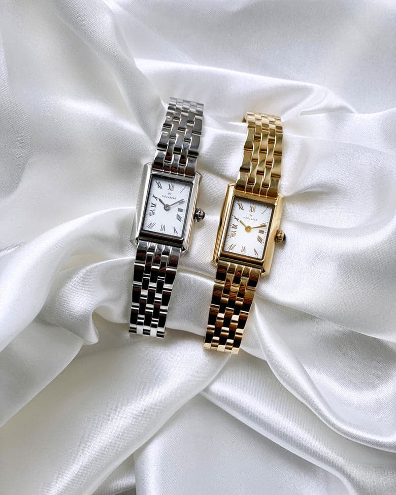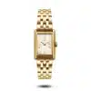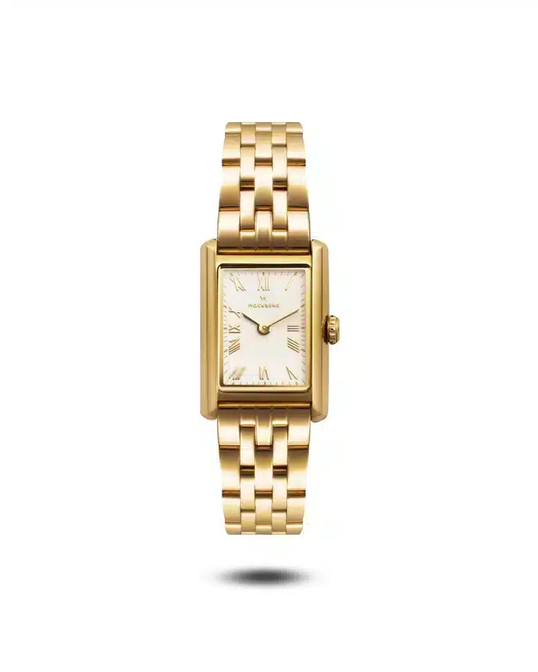 Klokkens klassiske og firkantede urkasse gir et moderne og eksklusivt uttrykk. Klokken har gullfarget stållenke, hvit skive og romertall. Den måler 18 x 22 mm og er vanntett til 3 ATM.