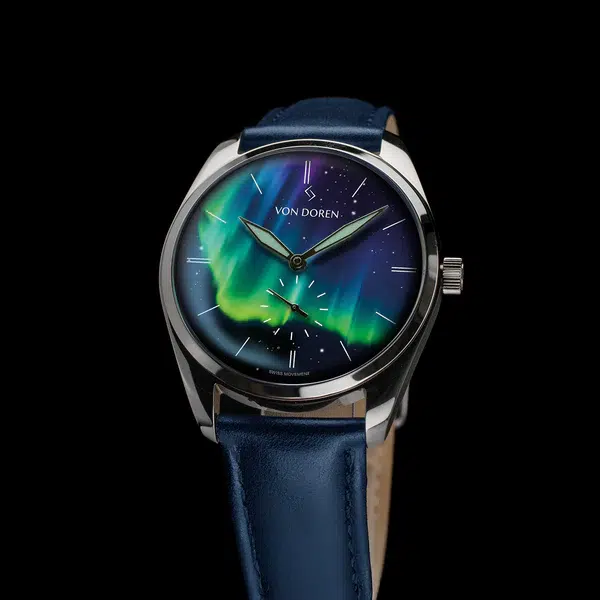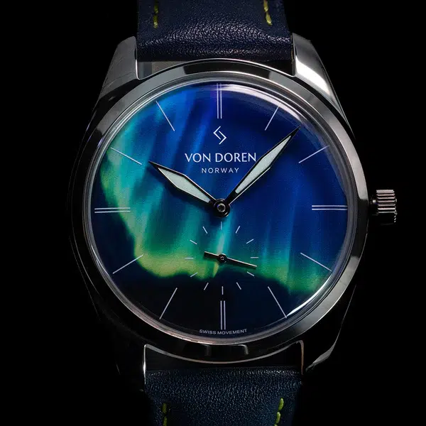 Inspirert av det majestetiske fenomenet Aurora Borealis, fanger Runde Nordic Light nordlysets magi i et tidløst og elegant design. Klokken kombinerer skandinavisk minimalisme med detaljer inspirert av nordlysets fargespill. De små stjernene på skiven er belagt med lume, slik at de lyser svakt i mørket.